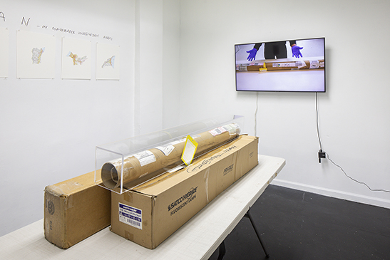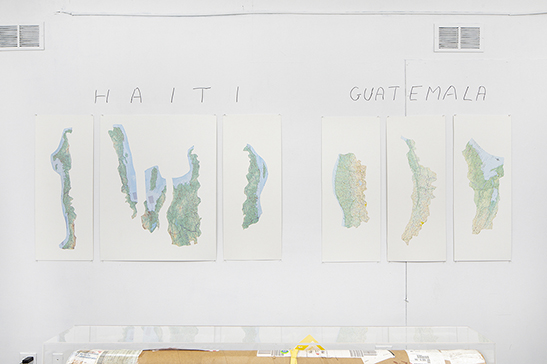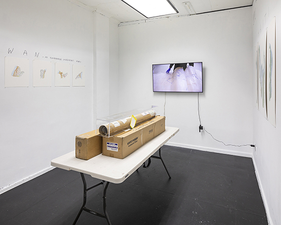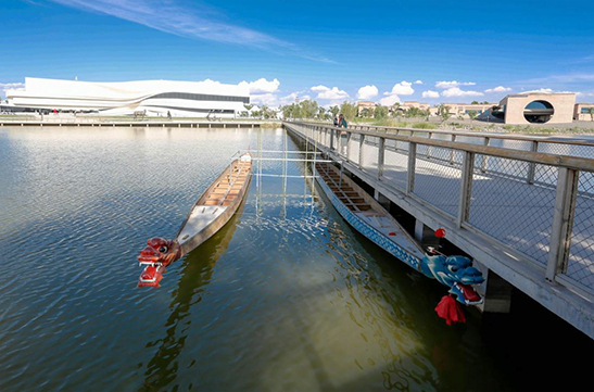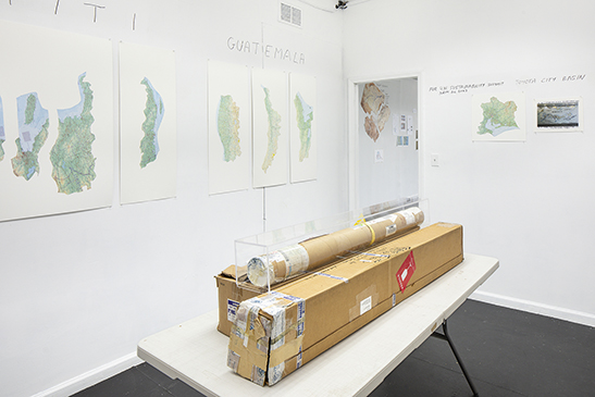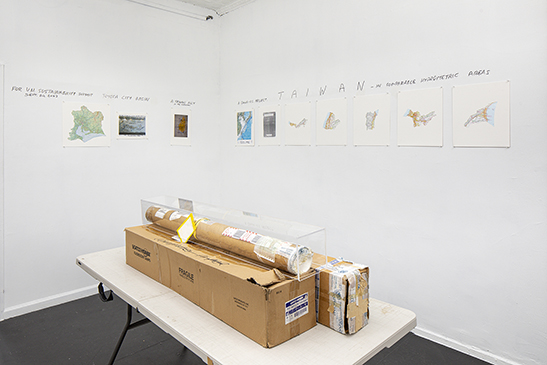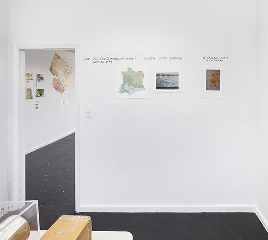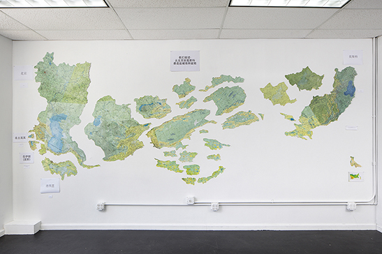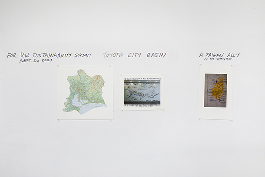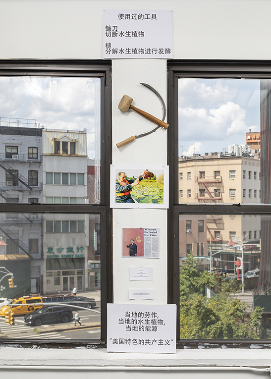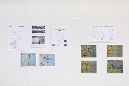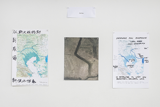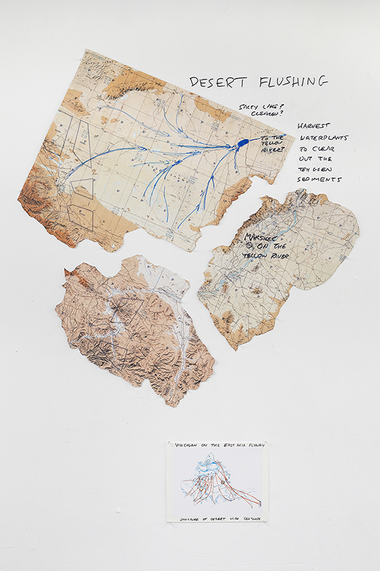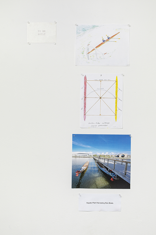 (2) Completed in 2018, with also the assembly of a rowing catamaran which, with hanging scythes, could be paddled through vegetation-rich lakes in an inland delta, near the Gobi Desert; all saltwater basins between Beijing, Moscow, and Tehran were displayed. A similar industrial-rowing project for the vegetation-rich canals of the Netherlands, researched and budgeted with a one-month sojourn at the Gemeente Museum, was submitted to the Dutch Ministry of Economics, then to Shell. A Shell executive for North America (specializing in tar sands) canceled any such project, saying, "You will not be allowed."